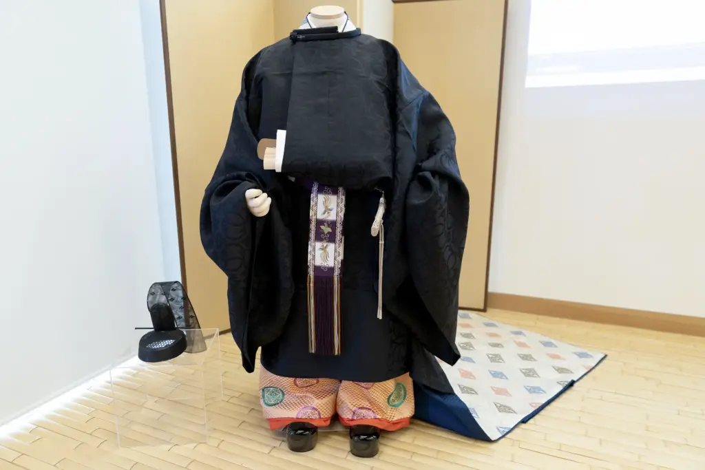 また会場には装束の例を展示。製作を担当する株式会社井筒の山本信之社長のお話もお伺いしながら、一年後の開催日へ向けて思いを膨らませる時間となりました。そして、実行委員会梅原和久委員長から行幸行列参加の先行エントリー方法を発表させていただきました。