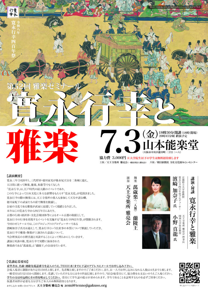 2026年7月3日(金)山本能楽堂(大阪市中央区)にて開催されます第52回雅楽ゼミナール 「寛永行幸と雅楽」に寛永行幸四百年祭プロデューサー 濱崎加奈子が登壇いたします。
